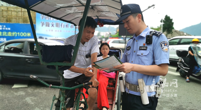 同时,交警也向周围市民分发了宣传资料,告知大家通告内容,请大家一起监督,共同维护县城范围内的交通文明。“县前路从百货前到自然资源与规划局这段路是禁止三轮车通行的,再从那里沿永兴路到交警上塘中队旧址也不可以,希望你们能帮我一起监督。”交警朱启勇拿着宣传资料对市民说道,市民对此表示赞同,认为对三轮车进行严格管理,虽然在有些时候会不太方便,但一定会有利于提升城市环境和交通情况。