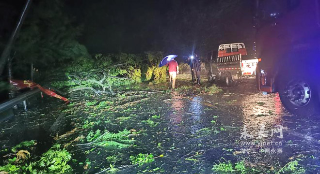 8月4日凌晨4点,桥头镇工作人员在开展巡查的时候发现S333省道林福-闹水坑段路面有树木、电线杆倒塌,电缆掉落,情况紧急,农业农村服务中心郑贤峰、季统政第一时间下车设置路障,指挥过往车辆绕行,并通知相关部门进行清理。